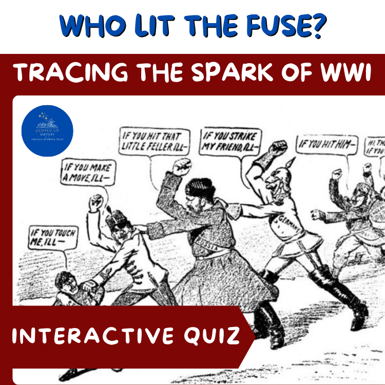 Who Lit the Fuse? Tracing the Spark of WWI invites learners to explore events leading to WWI’s outbreak. Through an interactive quiz, they’ll judge pivotal moments, from Archduke Franz Ferdinand’s assassination to the July Crisis, deciding which nations share the blame. Ideal for history enthusiasts seeking an immersive experience.